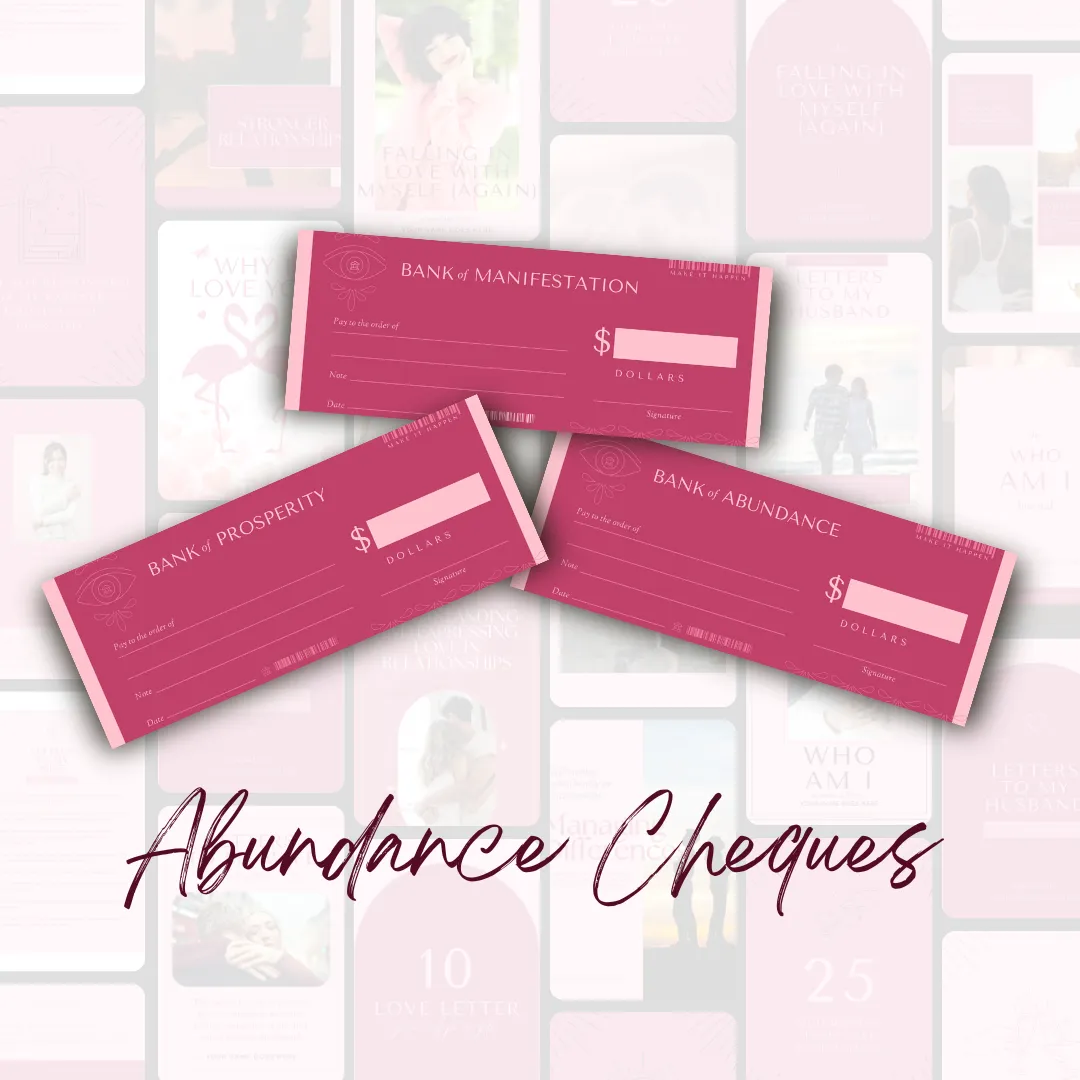 Abundance Cheques" is a unique resource designed to empower their clients in manifesting abundance, allowing individuals to set intentions for financial and personal prosperity as a part of manifestation rituals and visualize their goals